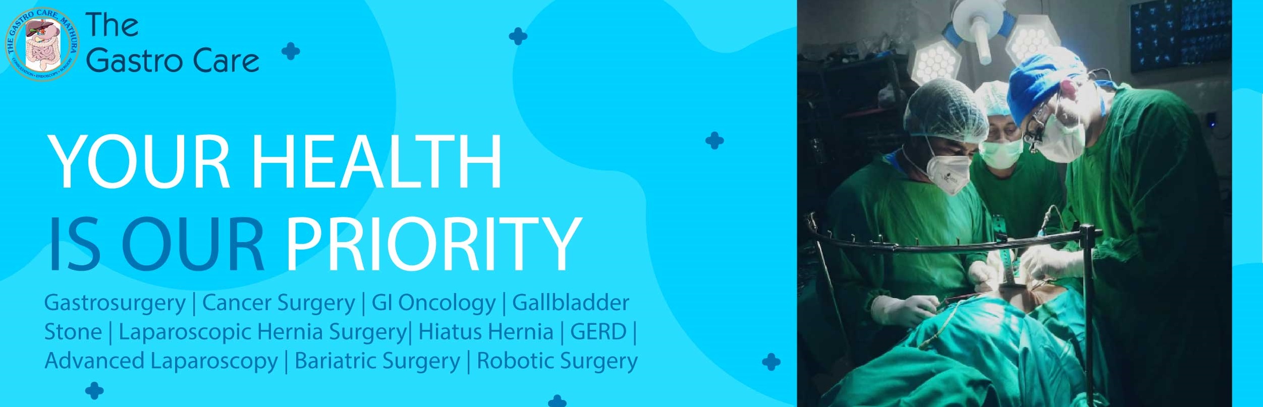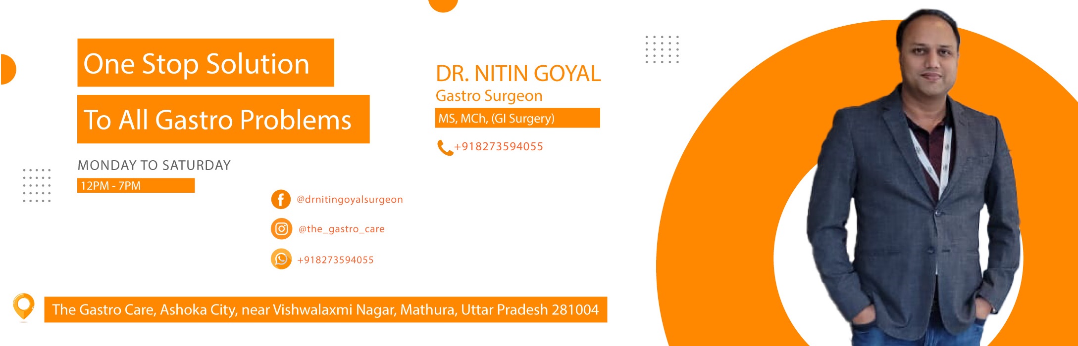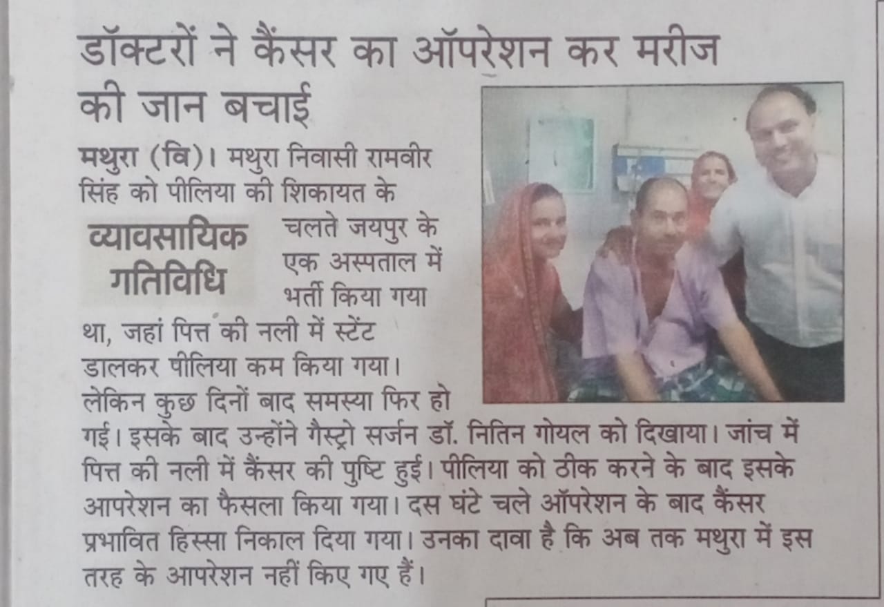 Dr. Nitin Goyal, M.Ch., specialised in Gastro Surgery, Liver Transplant and Vascular Surgery is a renowned gastrosurgeon in Mathura. His hospital, "The Gastro & Liver Care," is situated opposite Highway Plaza, near Mandi Chauraha, Surya Nagar, Mathura, Uttar Pradesh. Equipped with all the facilities and with the support of hardworking staff, he is doing a great job with his work, such that now people don't rush to Delhi or elsewhere for their gastro-related problems, no matter how severe they may be. With great command and knowledge of all the latest technologies in his field, be it Robotic Surgery ,he has cured many patients of serious illnesses successfully , thus making headlines in the newspaper many times.
