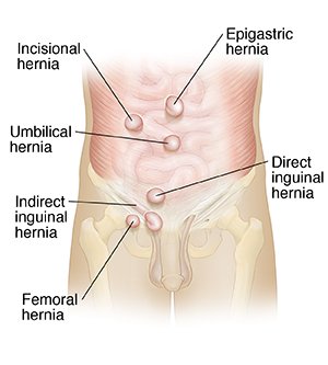 A hernia is the protrusion of an organ through the structure or muscle that usually contains it. The condition occurs most often in the abdominal wall, when the intestine pushes through a weak spot in the wall. The most common abdominal wall hernia is an inguinal hernia.